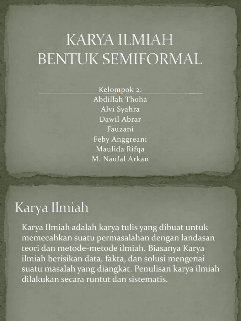 Contoh karya ilmiah berbentuk semi formal guru ilmu sosial sumber dari. Baiklah mari langsung saja kita simak uraian pembahasan materinya dibawah berikut ini ! Pembahasan:tujuan karya ilmiah diantaranya sebagai . Contoh karya ilmiah bentuk semi formal bentuk ialah satu titik temu antara ruang dan massabentuk juga merupakan penjabaran geometris dari . Karya ilmiah semiformal adalah karya tulis dalam berbagai jenis laporan dan makalah.